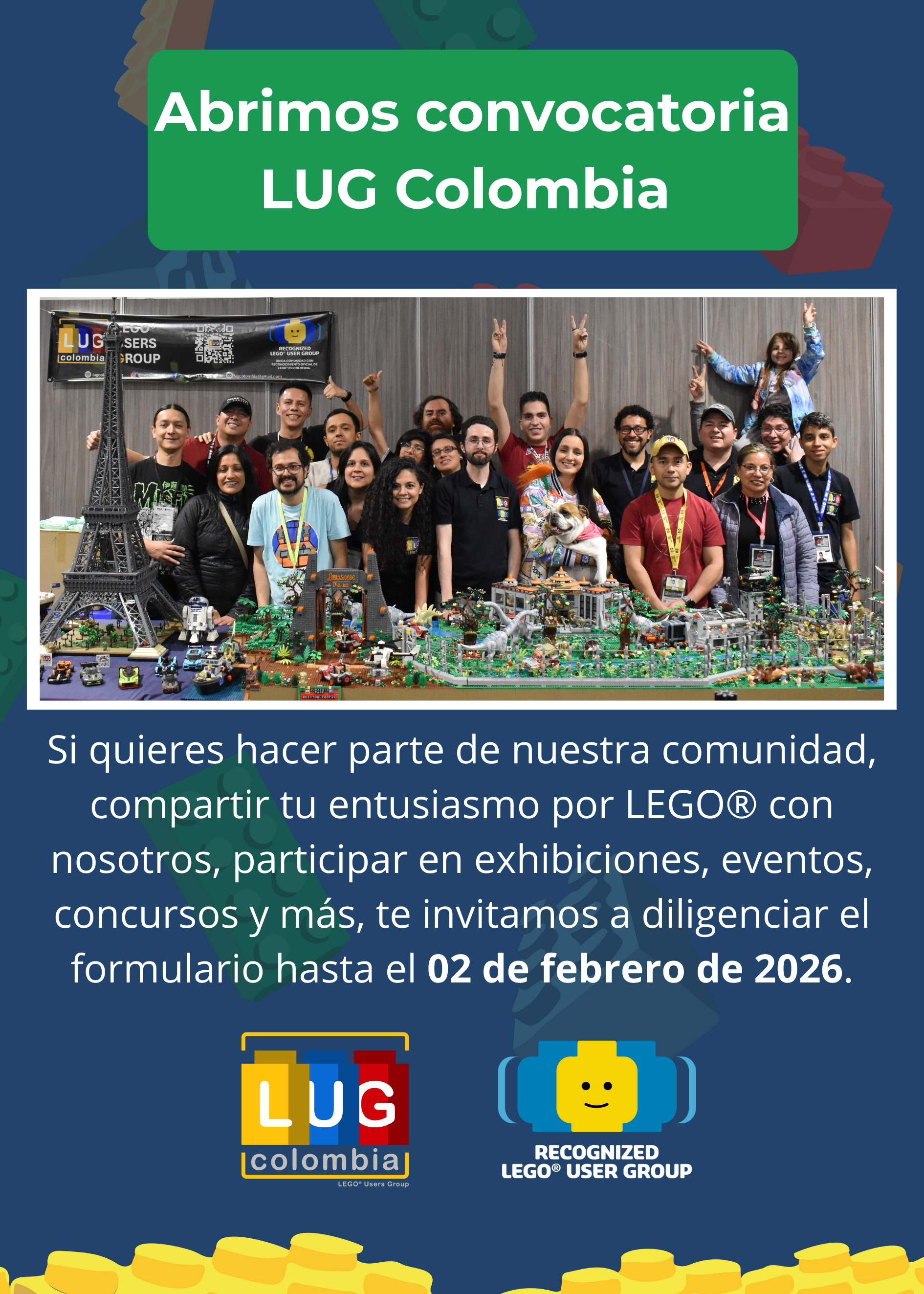 Si quieres hacer parte de nuestra comunidad, compartir tu entusiasmo por LEGO® con nosotros, participar en exhibiciones, eventos, concursos y más, te invitamos a diligenciar el siguiente formulario hasta el 07 de febrero de 2025.